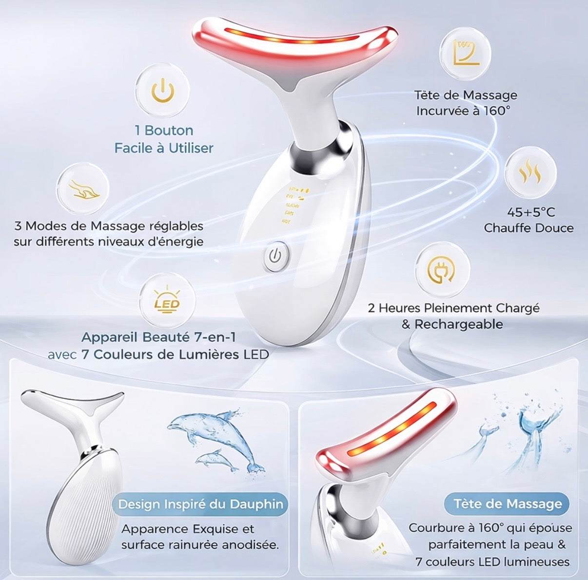 Technologie 3-en-1 : luminothérapie LED 7 couleurs, microcourants EMS haute fréquence et chaleur douce à 45°C.