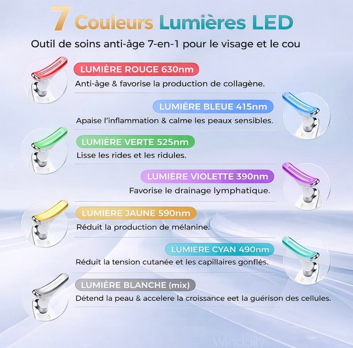 7 couleurs LED avec intensité réglable : stimule la peau, améliore l’élasticité, réduit rides et ridules, calme l’acné et uniformise le teint.